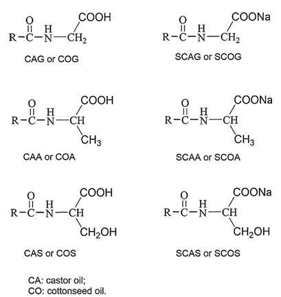 酰基氨基酸表面活性劑,即相應的CAG、COG、CAA、COA、CAS和COS的鈉鹽,通過用NaOH水溶液中和酰基氨基酸至pH 8-9直至獲得完全澄清的溶液來制備。這些鈉鹽分別命名為SCAG、SCOG、SCAA、SCOA、SCAS和SCOS。