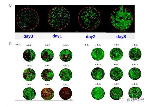 圖4A.微流控腫瘤微陣列藥物測試系統(tǒng)包含一種復(fù)合式結(jié)構(gòu)開放式微流控芯片以及移液工作站;B.微流控芯片上腫瘤微環(huán)境重建的示意圖。3D培養(yǎng)腫瘤細(xì)胞模擬腫瘤實(shí)質(zhì),水凝膠模擬支持和滋養(yǎng)腫瘤細(xì)胞的腫瘤基質(zhì),納米孔薄膜擴(kuò)散屏障模擬血管內(nèi)皮層;C.微流控芯片上連續(xù)三天內(nèi)MCF-7乳腺癌細(xì)胞增殖情況。(Calcein-AM/EthD-1染色,比例尺:200μm);D.抗腫瘤藥物正交組合測試結(jié)果。藥物測試包括LO2肝細(xì)胞和MCF-7乳腺癌細(xì)胞對A.阿霉素,B.紫杉醇和C.順鉑的3因素3水平正交組合藥物的反應(yīng)。