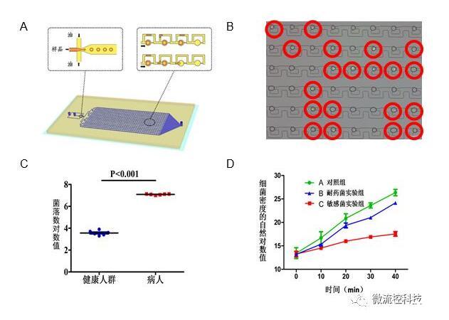 圖3A.液滴微流控芯片原理設(shè)計圖結(jié)構(gòu)包含上游的液滴生成區(qū)和下游的液滴捕獲區(qū);B.利用液滴熒光成像分辨細(xì)菌陽性和陰性液滴;C.液滴數(shù)字化分析顯示健康人和尿路感染病人尿液細(xì)菌計數(shù)差別;D.液滴數(shù)字化分析顯示敏感和耐藥細(xì)菌對于抗生素的反應(yīng)。