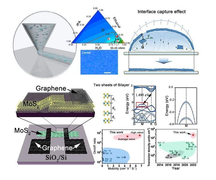 二維(2D)半導體材料為將摩爾定律擴展到原子尺度提供了機會。與傳統基于蒸鍍和光刻技術的加工技術相比,印刷電子因成本效益、靈活性以及與不同襯底的兼容性而受到關注。目前,印刷的二維晶體管受到性能不理想、半導體層較厚和器件密度低的制約。同時,多數二維材料油墨通常使用高沸點溶劑,隨之而來的問題包括器件性能退化、高材料成本和毒害性等,難以大規模應用。因此,發展簡單且環保的策略對于制造低成本、大規模的打印二維材料功能器件具有重要意義。