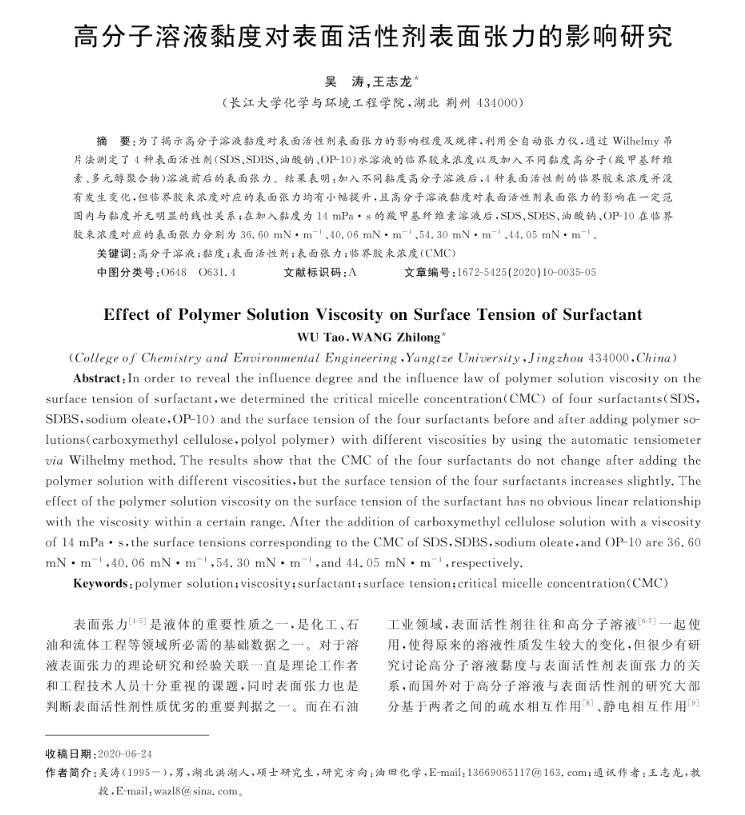 為了揭示高分子溶液黏度對表面活性劑表面張力的影響程度及規(guī)律,利用全自動張力儀,通過Wilhelmy吊片法測定了4種表面活性劑(SDS、SDBS、油酸鈉、OP-10)水溶液的臨界膠束濃度以及加入不同黏度高分子(羧甲基纖維素、多元醇聚合物)溶液前后的表面張力。結(jié)果表明:加入不同黏度高分子溶液后,4種表面活性劑的臨界膠束濃度并沒有發(fā)生變化,但臨界膠束濃度對應(yīng)的表面張力均有小幅提升,且高分子溶液黏度對表面活性劑表面張力的影響在一定范圍內(nèi)與黏度并無明顯的線性關(guān)系;在加入黏度為14 mPa·s的羧甲基纖維素溶液后,SDS、SDBS、油酸鈉、OP-10在臨界膠束濃度對應(yīng)的表面張力分別為36.60 mN·m~(-1)、40.06 mN·m~(-1)、54.30 mN·m~(-1)、44.05 mN·m~(-1)。