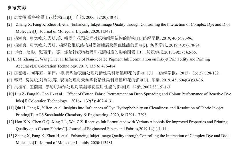 【摘要】:為了研究活性染料墨水黏度和表面張力對棉織物印花性能的影響,配制不同黏度和表面張力的活性紅墨水,測試打印后織物的滲透率、K/S值、墨量及打印線寬等指標(biāo)。結(jié)果表明:提高墨水黏度會(huì)降低墨滴在織物上的潤濕和滲透性能,打印到織物的墨量減少,打印清晰度下降。不同黏度的墨水對打印線條經(jīng)緯向的清晰度影響機(jī)制不同,表面張力對織物打印性能的影響比黏度小。