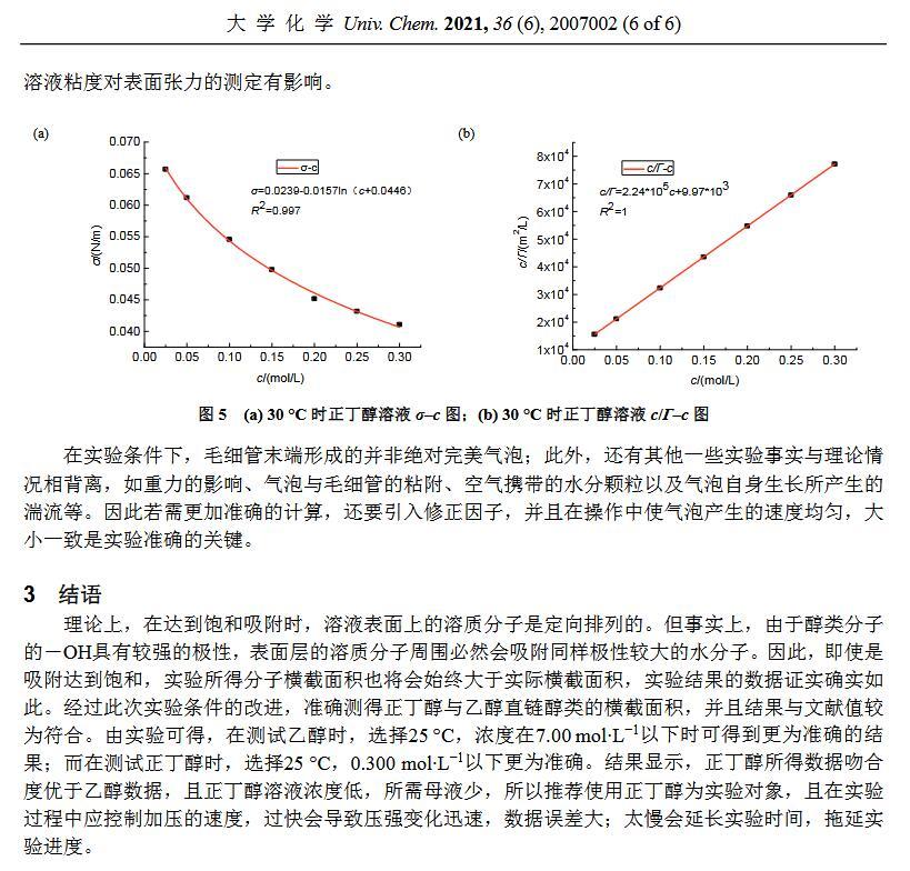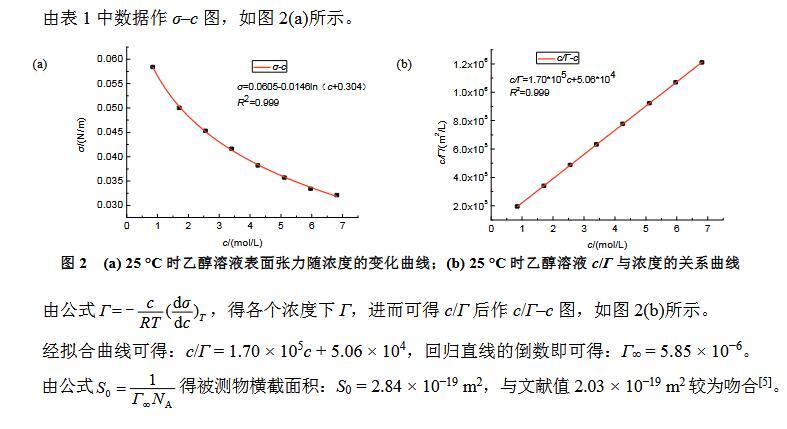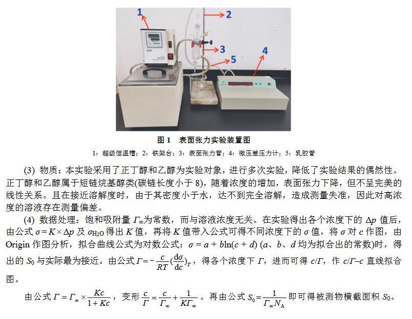 最大氣泡壓力法是大學物理化學實驗中測定溶液表面張力的一個經典方法[1–3]。由于最大泡壓法測定溶液表面張力實驗裝置較為簡單,學生也易于理解其原理,且不用測定液體密度ρ和接觸角θ,因而成為測定溶液表面張力的一個基本物理化學實驗[4]。通過實驗可以鞏固及加深理解有關溶液表面吸附的理論知識,通過數據處理可以熟練掌握其有關方程式。但由于各方面條件的局限,學生所測試的實驗數據與文獻值不能較好吻合。鑒于此,在已有的實驗裝置下,對實驗進行了細致的條件探索,如:更換測試物,變換溫度和細化溶液的濃度等,以期得到與文獻較吻合的實驗數據,從而為教師及本科生等相關實驗人員提供一定的理論指導。