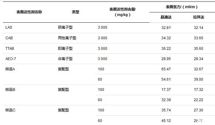 對于溶液而言,表面活性劑的存在能顯著降低表面張力,本文研究了不同表面活性劑溶液,同一含量下,兩種方法測試結(jié)果的差異以及同一表面活性劑溶液,不同含量下兩種方法測試結(jié)果的差異。所有方法按規(guī)范操作執(zhí)行,測試溫度25℃,平行測定5次取算數(shù)平均值,比較結(jié)果如表2所示。