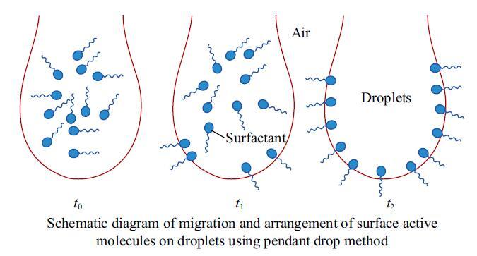 結(jié)果表明,在動態(tài)表面張力曲線圖中,A,B,C三種樣品在60 mg/kg的較低含量下,表面張力均呈現(xiàn)先快速降低而后緩慢降低最終達(dá)到平衡的趨勢,表明表面活性劑分子在液滴表面上確實(shí)存在著隨時間變化逐漸吸附平衡,排列完整的現(xiàn)象,如圖4所示,表面活性劑分子在表面完全吸附、排列緊密需要一定的時間,顯然在使用懸滴法進(jìn)行測定時,時間效應(yīng)直接影響著表面張力測定的誤差大小,符合前文所述結(jié)論。而樣品B在100 mg/kg含量下,動態(tài)表面張力趨勢圖成一條直線,證明該種表面活性劑在液滴表面遷移速度較快,在液滴完全注射形成之前已快速到達(dá)平衡狀態(tài),表面活性劑分子在表面得以充分排布,這解釋了較低含量的表面活性劑溶液的靜態(tài)表面張力與國標(biāo)推薦方法吻合程度差異較大的原因。這是由表面活性劑分子自身性質(zhì)所決定的,與其極性基的類型、結(jié)構(gòu)、個數(shù)、疏水基長度等息息相關(guān)。而單一液體,未具有含量差,故不存在表面活性劑分子從溶劑內(nèi)部遷移吸附至表面這一過程,所以其動態(tài)表面張力曲線呈現(xiàn)為平穩(wěn)直線。