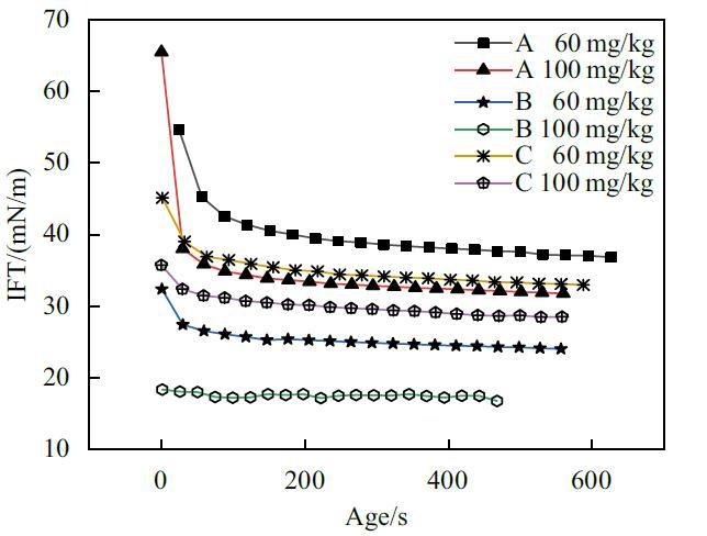 為了充分證明時間效應(yīng)對懸滴法測定結(jié)果會造成影響,實(shí)驗(yàn)使用懸滴法對A,B,C三種表面活性劑復(fù)配溶液較稀含量下的動態(tài)表面張力進(jìn)行了研究。結(jié)果如圖3所示。