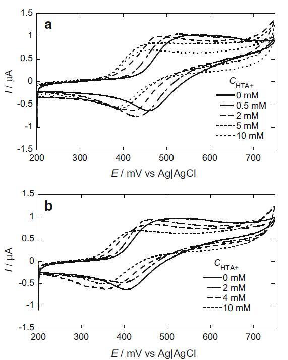 我們還研究了 HTA+ 陽離子的影響(圖 6)。 來自界面張力測量的 HTA+ 離子的 cmc 與圖 6 標題中所述的 CV 測量溶液相同,為 3.95 mM。 I2/I? 的陽極和陰極峰均高于不存在 HTA+ 時的峰。 陽極和陰極峰值電流的增加是由于被捕獲的 I? 和 I2 從 hp-β-CD 釋放到主體中,這是由 hp-β-CD 腔中的 I? 和 I2 置換引起的與 HTA+。 另一方面,隨著 HTA+ 的濃度增加到 cmc 以上,陽極和陰極峰值電流都變得低于預膠束濃度下的峰值電流。 在 I2 和 I- 鍵合到膠束經歷電子轉移之前,膠束必須轉向,使 I2 和 I- 面向電極表面。 它導致峰值電流的降低。 此外,陽極和陰極峰值電位都向負方向移動。 這表明溶解在 HTA+ 膠束中的 I2 比鍵合到 HTA+ 膠束表面的 I- 更穩定。 隨著 HTA+ 濃度增加到 5 mM,在 330 mV 處觀察到一個尖銳的吸附減少峰。 已知在不存在任何表面活性劑的情況下,在鉑電極表面形成的 I2 會吸附在電極表面 [19]。 在我們的系統中,HTA+ 在低 HTA+ 濃度下抑制了 I2 的吸附。 然而,隨著HTA+濃度的增加,形成了HTA+單層,導致電極表面HTA+單層中的I2被吸收。 隨著 HTA+ 濃度增加至 10 mM,吸附還原峰消失。 在這個濃度下,在電極表面形成的 I2 溶解到 HTA+ 膠束中。 因此,沒有觀察到吸附峰。