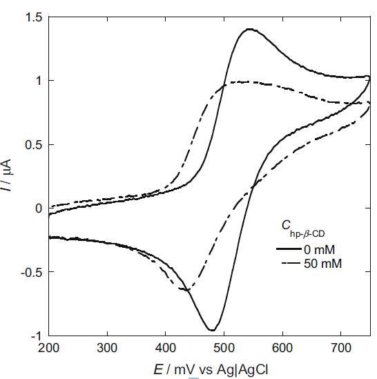 在這里,我們選擇 I2/I? 作為電化學探針,因為 I? 的電荷有望使其與陽離子膠束的結合變得容易,并且電中性 I2 有望在膠束中表面活性劑的疏水部分之間增溶并溶解在電極表面的表面活性劑單層中。 我們研究了 hp-β-CD 對 I2/I- 氧化還原峰的影響(圖 5)。 在沒有 hp-β-CD 的情況下,觀察到 I- 在約 530 mV 處的陽極峰和 I2 在約 480 mV 處的陰極峰。 在 50 mM hp-β-CD 存在下,陽極和陰極峰值電流均降低,并且它們的峰值電位向負方向移動。 陽極峰值電流的降低是由 I? 與 hp-β-CD 的親水表面結合引起的。 另一方面,陰極峰值電流的降低是由 hp-β-CD 疏水腔中包含 I2 引起的 [18]。 峰值電位的負移表明結合在 hp-β-CD 腔中的 I2 比結合到 hp-β-CD 表面的 I- 更穩定。
