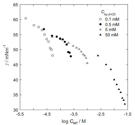 圖 1 不同 hp-β-CD 濃度下的界面張力 (γ) vs. log CNP/mol dm-3