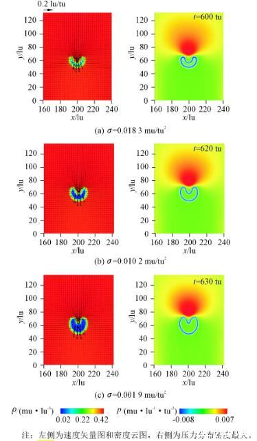 本節(jié)選取空化泡內外初始壓差Δp=0.003 8、0.006 8、0.010 2 mu/(lu·tu2)三種壓力,無量綱距離λ=1.6條件下,不同表面張力系數(shù)對空化泡潰滅過程中潰滅形態(tài)、流場、最大微射流速度和最大潰滅壓力的影響。