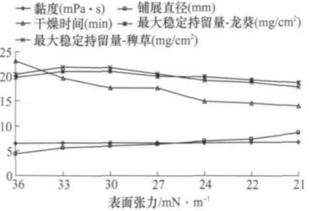 通過本研究可以說明適當(dāng)?shù)亟档筒莞熟⒅苿┑谋砻鎻埩蛟黾羽ざ染商岣叱輨┑纳锘钚?。除草劑活性能否充分發(fā)揮往往決定于霧滴在雜草葉表面的黏著、展布、濕潤、滲透與傳導(dǎo)。不同雜草的葉片結(jié)構(gòu)及生理機(jī)制往往對藥液理化性狀和藥液敏感性不同,本研究中液滴的鋪展直徑、干燥時間均采用石蠟?zāi)M植物葉片蠟質(zhì)層結(jié)構(gòu),僅能體現(xiàn)藥液理化性狀的相對變化趨勢,而不同類型的雜草對藥液物理性狀和藥液敏感性需進(jìn)一步研究。