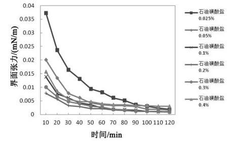 可以看出,當石油磺酸鹽總質量濃度較低時,初始界面張力值較大,當濃度較高時,初始界面張力值較低,但平衡后界面張力值變化不大。該復合體系與原油間的油水界面張力在90 min衡,120 min力穩定不變。可以確定,在0.025%~0.4%濃度范圍內石油磺酸鹽對最低界面張力值影響不大,都能形成10-3mN/m數量級的超低界面張力,且到達最低界面張力的時間基本相同,表現出較寬濃度范圍下的超低界面張力。