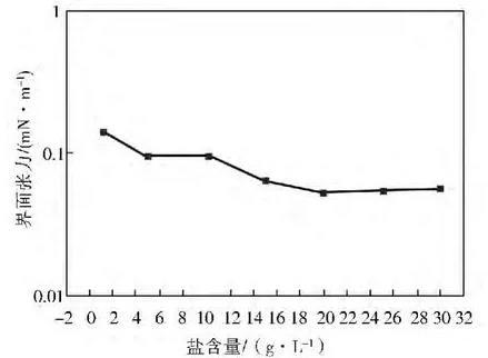 b.黏濃曲線體現出VES J良好的增黏特性,且在質量分數為0.02%時可使與W斷塊原油間油水界面張力降至10-2數量級;一定質量分數的無機鹽對黏彈性表面活性劑VES J的黏度特性產生積極影響,且體系可在礦化度30g/L時達到10-2數量級的界面張力,體現了復配體系良好的耐鹽特性;90℃較25℃黏度保留率達到74.6%,W地層溫度(65℃)有利于發揮體系降低油水界面張力能力。