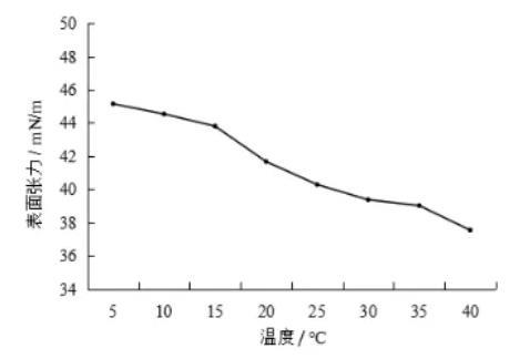 由圖1可以看出合成血液表面張力隨著溫度的升高而減少,從原來的45.149mN/m降至37.540mN/m。因?yàn)殡S著溫度升高,分子鍵引力減弱,表面張力隨溫度升高而減少。同時(shí),溫度升高,液體的飽和蒸氣壓增大,氣相中的分子密度增加,氣相分子對液體表面分子的引力增大,導(dǎo)致液體表面張力減少。