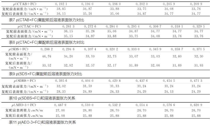 為了更好地提高表面活性劑的性能,降低表面活性劑的應(yīng)用成本,減輕其對環(huán)境的危害。在室溫下,分別測試不同濃度的碳?xì)浔砻婊钚詣┡cFC復(fù)配后表面張力的變化,實(shí)驗(yàn)結(jié)果見表7~11。