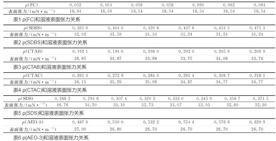 按照實(shí)驗(yàn)方法Hz制備表面活性劑溶液,在室溫下,測定FC、CTAB、CTAC、SDS、SDBS和AEO-3表面活性劑的表面張力,確定CMC,結(jié)果見表1~6。