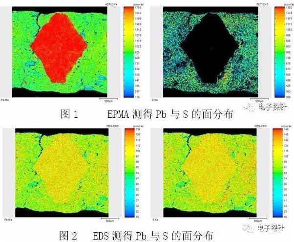 圖2為EDS測試結果,顯示Pb與S元素分布區域基本一致的現象,此為假象。這是由于兩個元素的主峰相互重疊,在能量上已不能被儀器區分開的緣故。