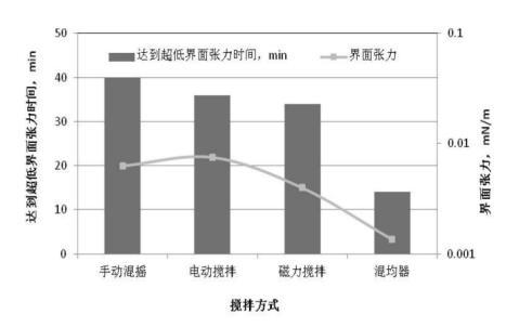 mN/m;手動(dòng)混搖的方式達(dá)到超低界面張力的時(shí)間最長(zhǎng),為40分鐘,電動(dòng)攪拌和磁力攪拌差別不大。混勻器攪拌方式使溶液能在短時(shí)間內(nèi)達(dá)到均相且均相程度高,均相程度越高,達(dá)到超低界面張力的時(shí)間越短。