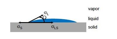 4、接觸角在在三種介質(zhì)的邊界面相交于一點的情形中,接觸線受到三個不同邊界面的表面張力,為了維持平衡,表面張力的合力在這些方向上的分量必須等于零,這就要求三個邊界面交成一定的角度。