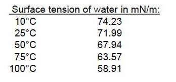 2、同種液體,在不同溫度時表面張力會不同比如下面表格溫度越低表面張力越大;