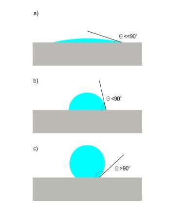 由于接觸角的不同和浸潤與非浸潤的情況就可以解釋題主所說的完全不同的水滴效果常見的有下圖三種情況;